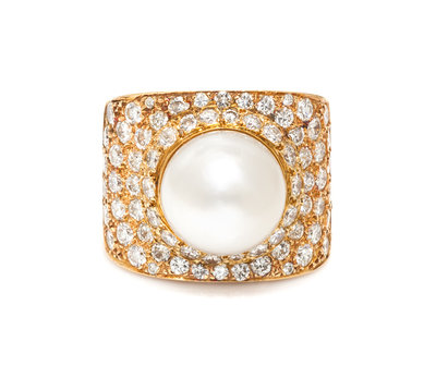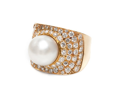 An 18 Karat Yellow Gold, Cultured South Sea Pearl and Diamond Ring,