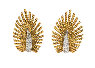 A Pair of 18 Karat Yellow Gold, Platinum, and Diamond Earclips, Marchak,