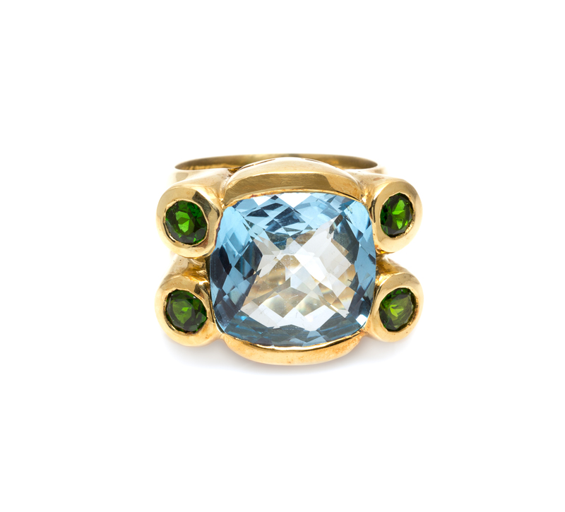 An 18 Karat Yellow Gold, Blue Topaz and Green Tourmaline Ring,