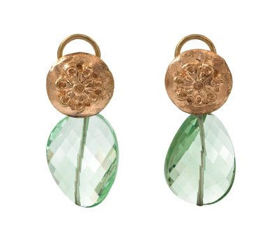 A Pair of 18 Karat Rose Gold and Green Quartz Drop Earclips,