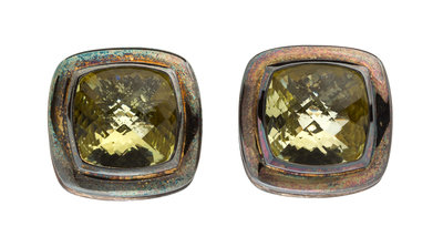 containing two cushion shape checkerboard cut lemon quartz measuring approximately 10.75 x 10.50 mm and 10.95 x 10.00 mm within fluted surrounds.Stamp: 750 925 D. Yurman.Accompanied by a pouch signed David Yurman.