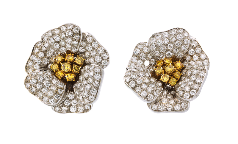 consisting of a central cluster design containing 16 round brilliant cut yellow diamonds (origin of color not tested) weighing approximately 1.55 carats total, within pave set surrounds containing 99 round brilliant cut diamonds weighing approximately 3.56 carats total.Stamp: 750.