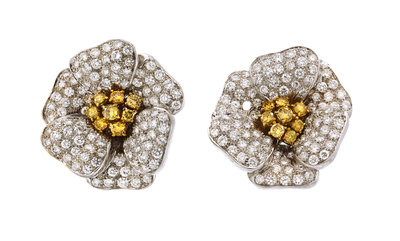 A Pair of 18 Karat Two Tone Gold, Colored Diamond and Diamond Flower Earclips,