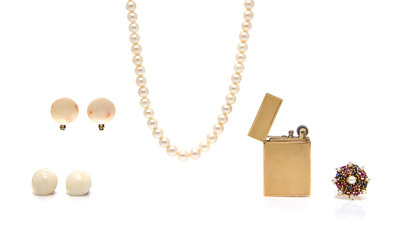 consisting of a partial 14 karat yellow gold clasp, a partial 18 karat yellow gold keychain, a 14 karat yellow gold pearl enhancer, a 14 karat yellow gold lighter, a 14 karat white gold double strand clasp, a pair of 14 karat yellow earclip findings, a collection of yellow gold bracelet links sections, a 14 karat yellow gold, cultured pearl, ruby and sapphire cluster ring, an unknotted graduated strand of 69 cultured pearls measuring approximately 5.66-7.47 mm in diameter, 33 loose cultured pearls measuring approximately 2.91-7.92 mm in diameter, four loose dyed black cultured pearls, two loose turquoise beads, two pairs of cabochon cut white coral earclips with gold tone earclips, numerous loose orange coral beads together with numerous loose green glass beads.