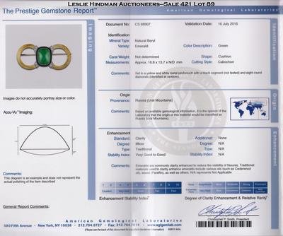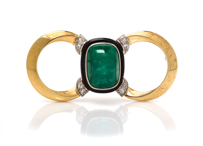 consisting of a central onyx plaque with loops of polished gold extending outward to the sides, the onyx center containing one cushion shape cabochon cut emerald weighing approximately 15.00 carats and measuring approximately 18.80 x 13.70 mm, together with eight transitional and old European cut diamonds weighing approximately 0.26 carat total.Accompanied by an American Gemological Laboratories emerald identification and origin certificate number CS 68907, dated July 16, 2015, stating Mineral Type: Natural Beryl, Variety: Emerald, Origin: Russia (Ural Mountains), Clarity Enhancement: Minor, Type: Traditional.