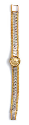 15.20 mm case diameter, gold dial signed PIAGET, baton numerals, gold lancette hands, circular yellow gold case, snap on case back, manual wind mechanical movement, two-tone link bracelet with white gold herringbone motif inner and yellow gold stone texture outer sections, box clasp.Caseback stamp: 3941/72983.Clasp stamp: Piaget 750 (maker's marks).