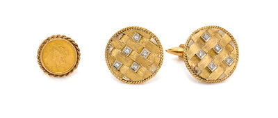 consisting of a pair of 18 karat yellow gold basketweave motif cufflinks containing 10 round single cut diamonds weighing approximately 0.20 carat total, together with a gold tie pin containing one British gold coin measuring approximately 13.72 mm in diameter (date obscured) within a raised bezel and outer rope texture surround.Cufflink Stamp: K.18Tie Pin Stamp: 14K (maker's mark).