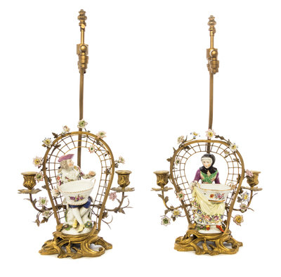 depicting figures with baskets beneath trellises encrusted with flowers, mounted as lamps.