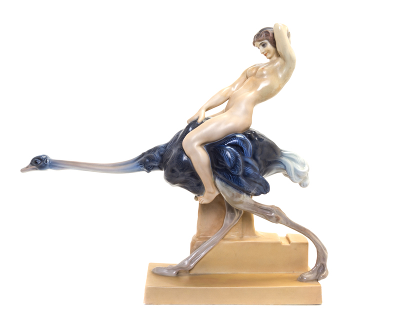 depicting a nude riding an ostrich.
