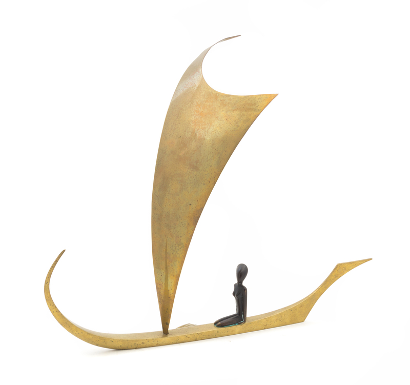 depicting a stylized figure in a sailboat.