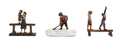 two depicting children balancing, the third set on a stone base and depicting a child shoveling snow.