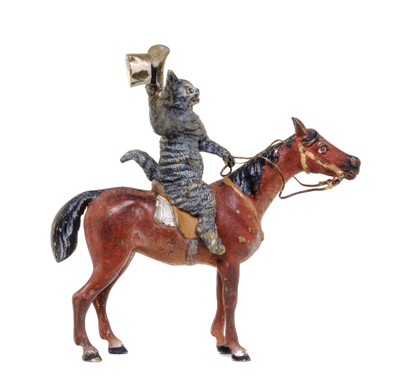 depicting a cat riding a horse and waving his hat.