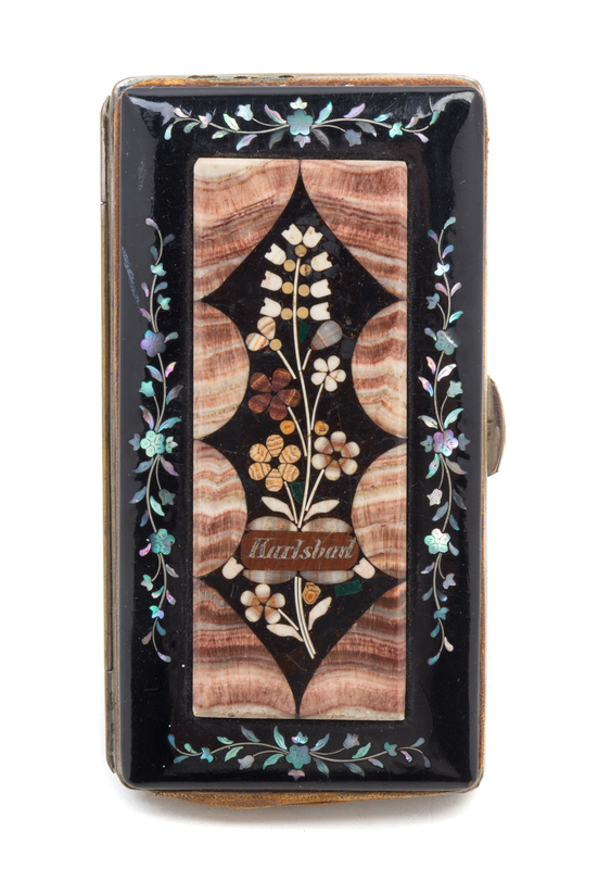 A Continental Aragonite, Hardstone and Abalone Inlaid Black Lacquered Souvenir Cigar Case