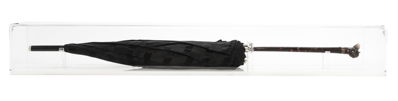 the parasol's handle with an agate terminal carved to resemble a bulldog, set in a lucite case.