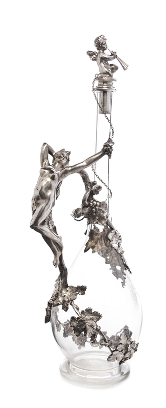 having a figural stopper in the form of winged putto playing a syrinx, the handle formed as a Bacchante joined to the body with grapevines, monogrammed within a rococo cartouche on one side.