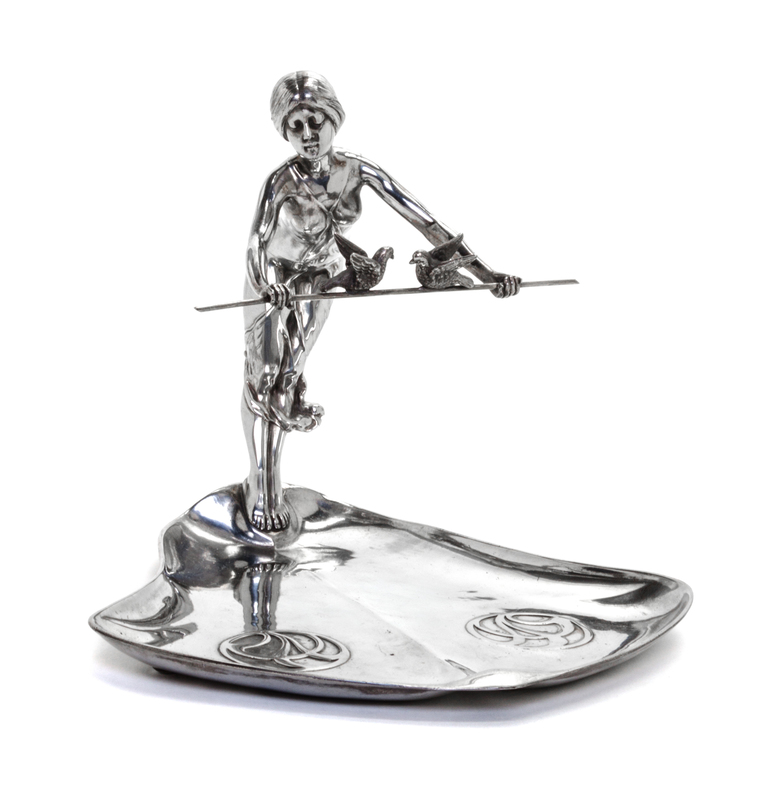 model number 247 stamped to the underside, worked to show a near topless maiden holding two doves on a narrow bar, standing on a shaped tray.