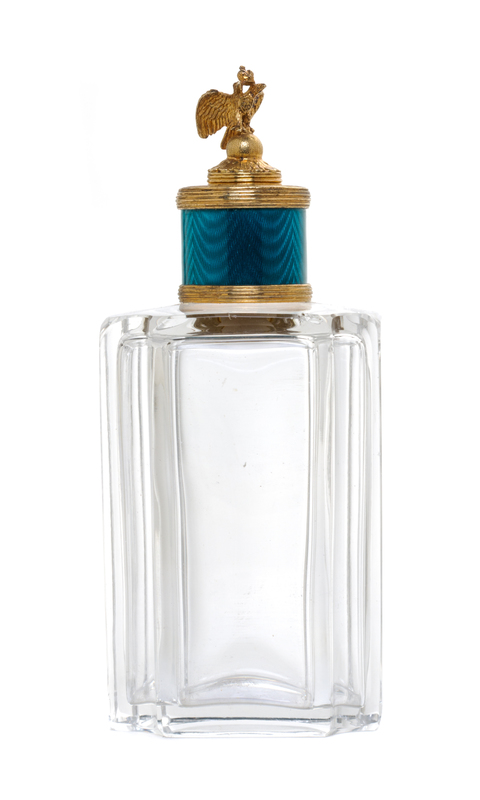 having a stopper with a crowned double-headed eagle finial over an engine turned collar with translucent green enamel, the rectangular bottle with concave corners.