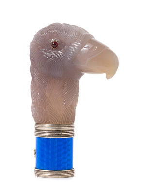A Guilloche Enamel and Silver Mounted Chalcedony Cane Handle