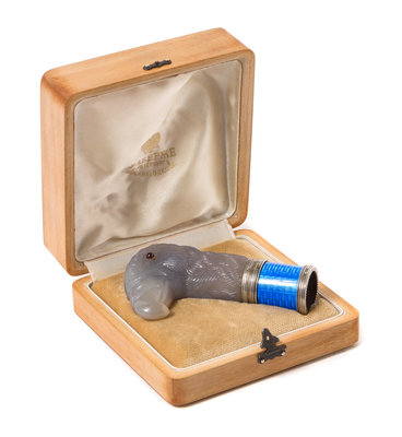 in the form of a parrot head with garnet-inset eyes, above a blue engine-turned collar, bearing spurious Farberge marks to the silver bands.
