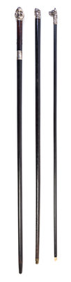the first, an English example, with rubbed marks, having a handle worked in the form of a plump gentleman with a cigar in his mouth, set over a tortoise shell collar; the second having a handle in the form of a clown's head bearing Birmingham marks and dated 1922; the third, an Austrian example, having a handle in the form of a hound's head over a collar worked to show foliate scrolls; each surmounting an ebonized shaft.