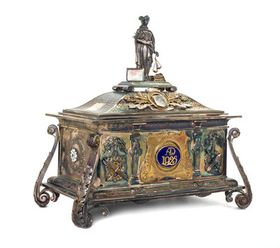 of rectangular form, the domed lift-off cover surmounted by a figural finial in the form of Lady Justice and opening to a red velvet lined vacant interior, the body worked to show various trophies, each side having an enameled plaque, the reverse plaque painted to show a church steeple, raised on acanthus decorated scroll feet.