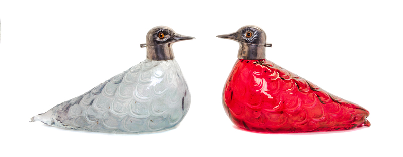 each bottle in the form of a duck, the silver collar and cap forming its head with glass eyes.