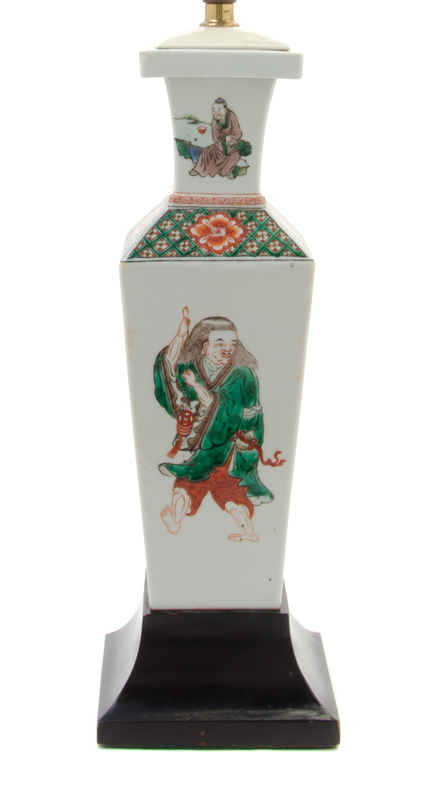 of square section, the tapering body painted to depict various images of immortal Liu Hai with coins, bats and toad, the shoulders decorated with flower heads against a diaper ground and the neck with four scholars in different pursuits, mounted as a lamp.