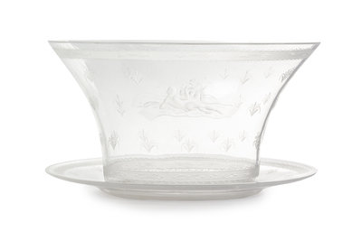 the bowl etched with two nudes and repeating foliate motifs, the saucer similarly decorated.