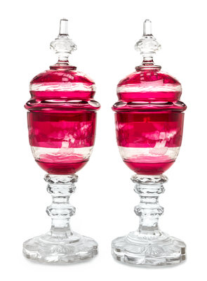 A Pair of Large Bohemian Ruby Cut to Clear Glass Deckelkopal