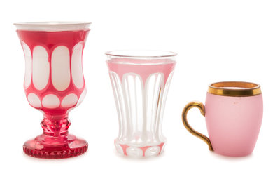 comprising a footed cup, a double overlay tumbler and a frosted cup with an applied handle.