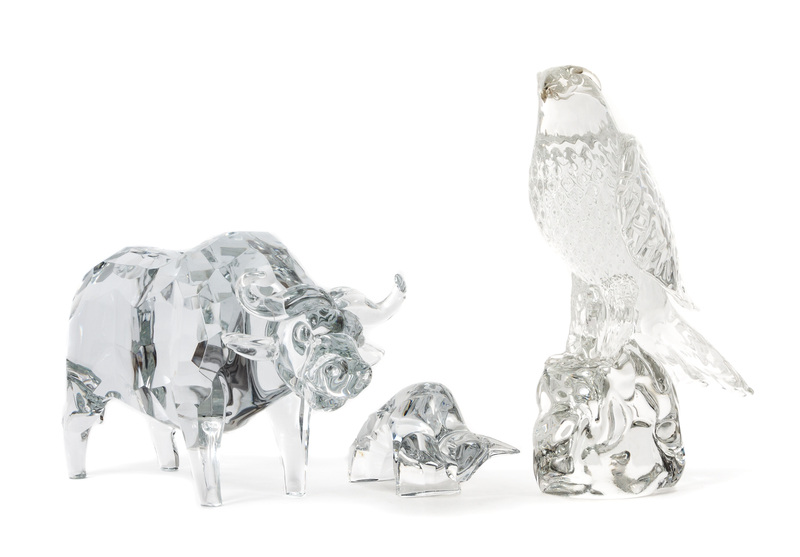 comprising a charging bull manufactured by Baccarat, a falcon and and a cape buffalo.