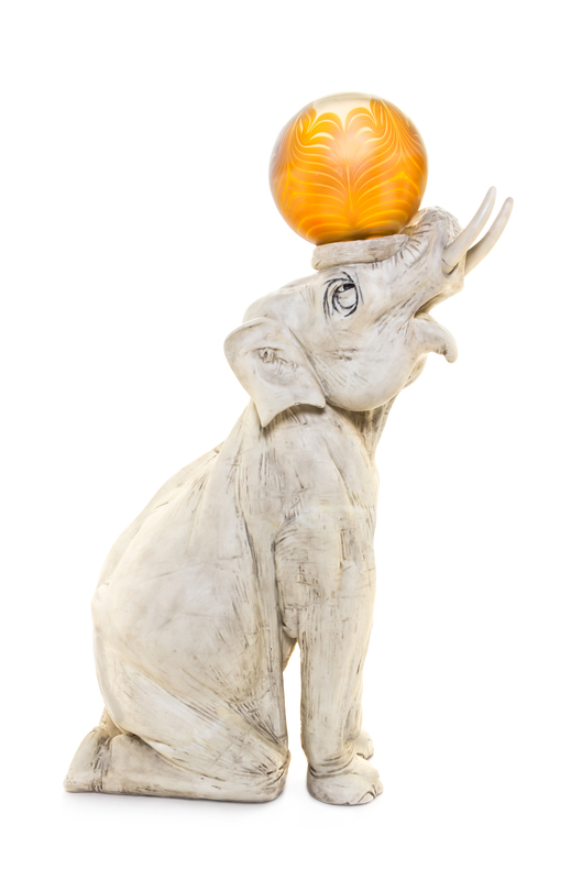modeled as an elephant balancing the iridescent glass shade as if it were a ball, the shade with pulled feather decoration and attributed to Loetz, the base with impressed factory marks and additional incised marks.