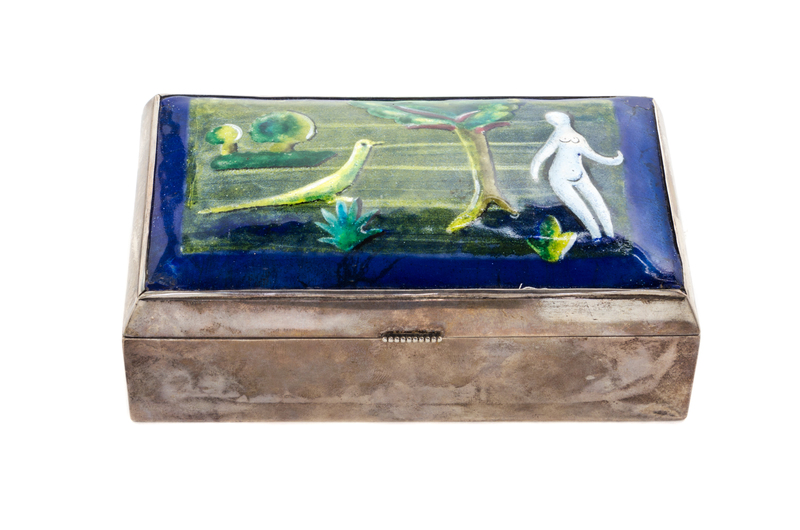 the rectangular lift top lid decorated with a landscape with a female figure and a bird.