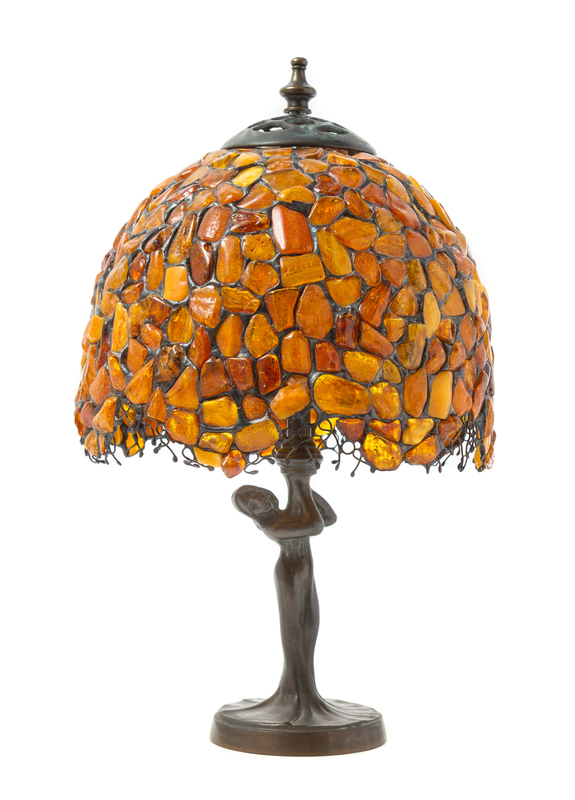 the domed beaded shade supported by a figure of a woman standing on a circular base.