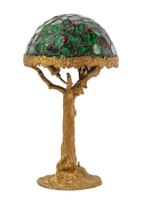 the domed shade raised on a gilt tree trunk form base with five lighting elements.