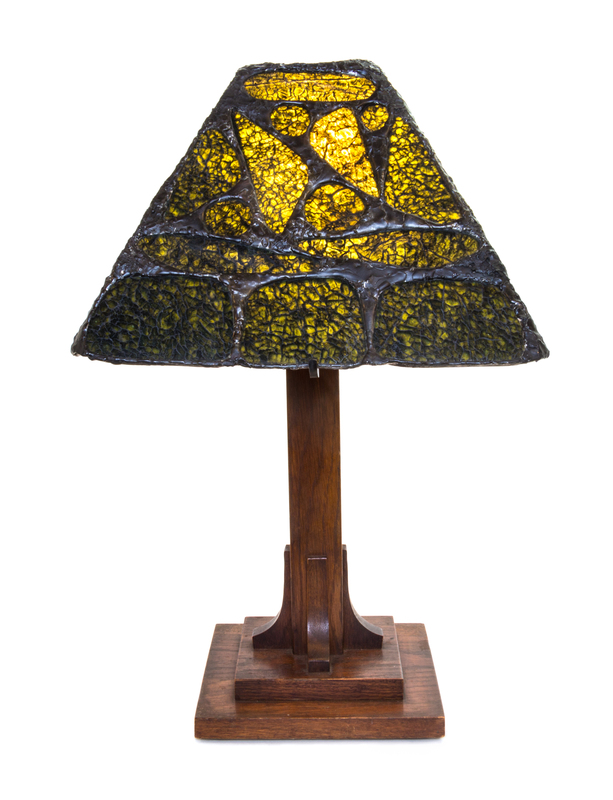 having a pyramidal shade with a flat top raised on an Arts and Crafts style oak base.