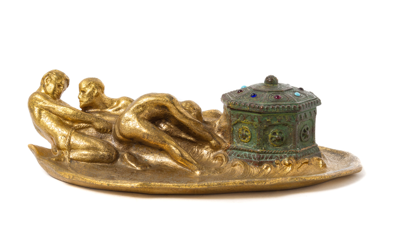 A Tiffany Studios Jeweled Gilt Bronze Figural Inkwell