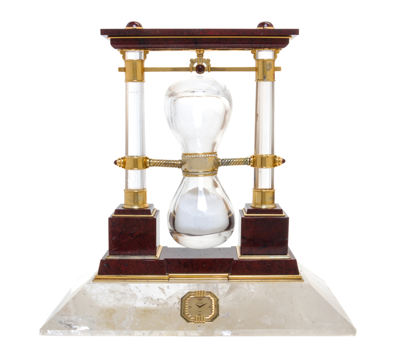 having a rectangular jasper capital joining twin rock crystal columns to support an hour glass over a jasper base of breakfront outline, the rectangular dial with canted corners and a quartz movement set into a sloping rock crystal base, in a fitted wood case.
