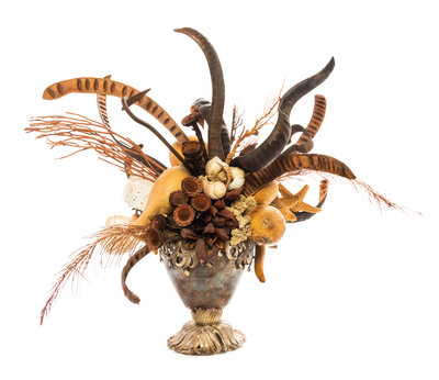 the vase of baluster form, its rim and foot applied with bands of seaweed, the bouquet inspired by the sea and composed of gourds, shells, starfish and lobster specimens.