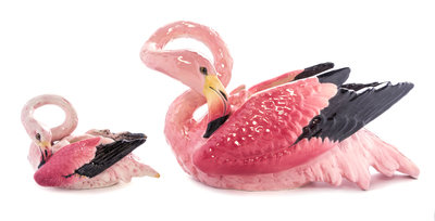 modeled as flamingos, both preening their wings, the larger marked JMF for Jerome Massier Fils, the smaller marked for Delphin Massier.
