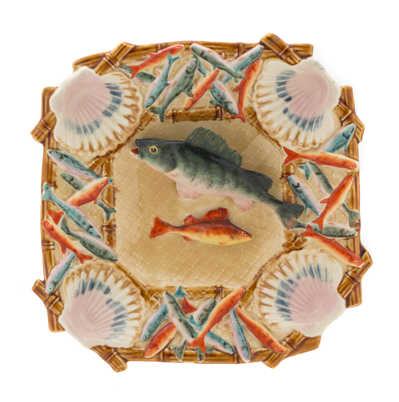 modeled with two fish at center, fish surrounding the border, four shells and bamboo at the edges.