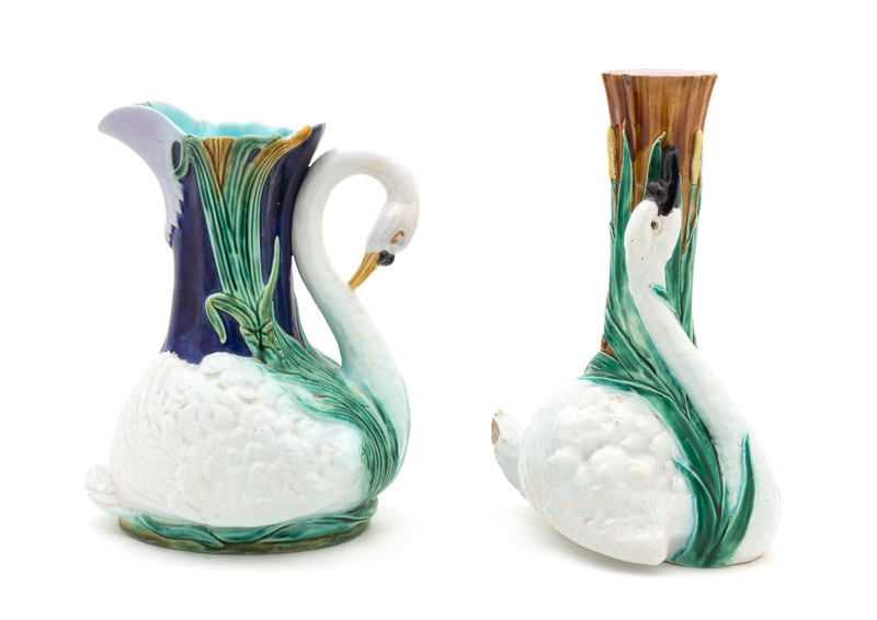comprising a vase and a pitcher, each worked to show a swan among reeds.