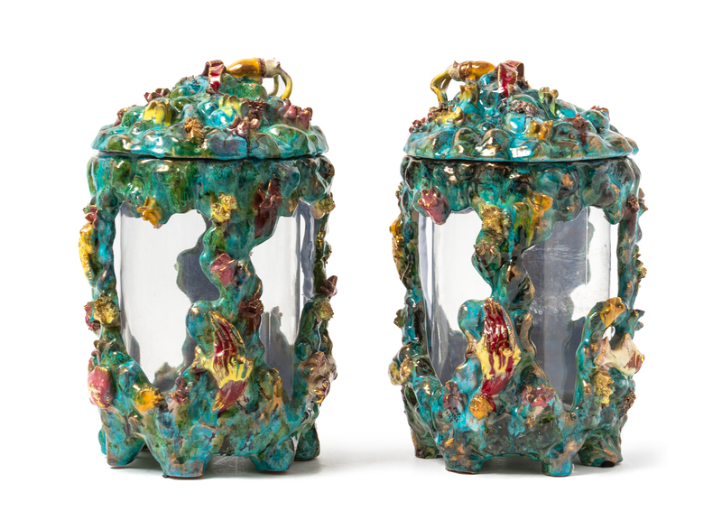 A Pair of Italian Majolica Covered Jars or Aquariums
