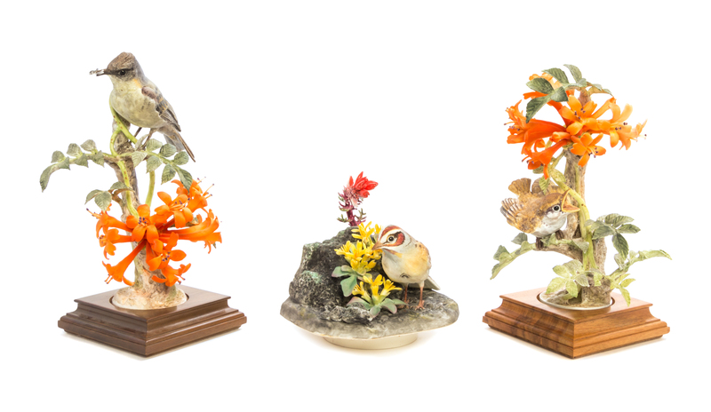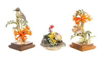 comprising two models of phoebes and flame vine and a model of a lark sparrow with twin pod and red gila, together with a reference book.