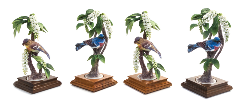 depicting buntings with choke cherries.