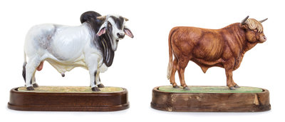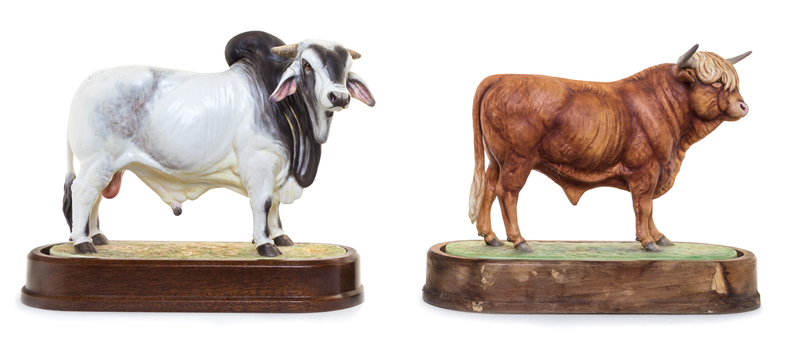 depicting a Highland bull and a Brahman bull, each on a fitted wood base.
