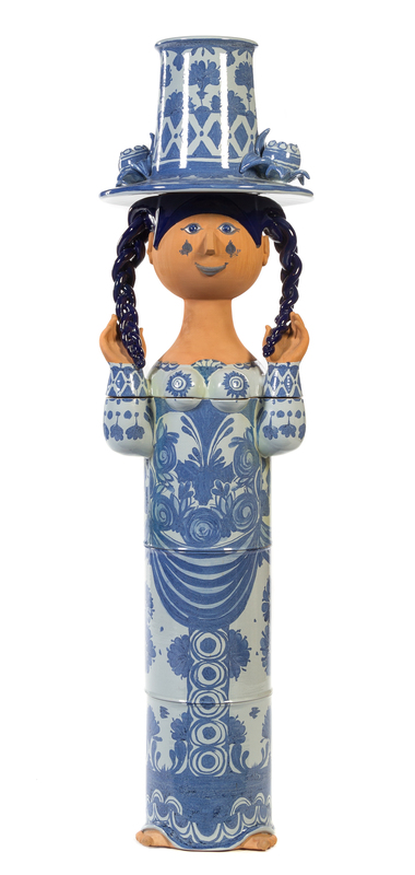 modeled as a blue-and-white-decorated woman supporting the vessel on her head.