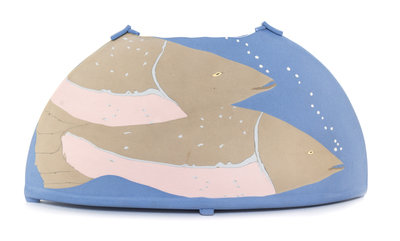 decorated with a double fish motif on a blue ground, signed indistinctly and dated underneath.