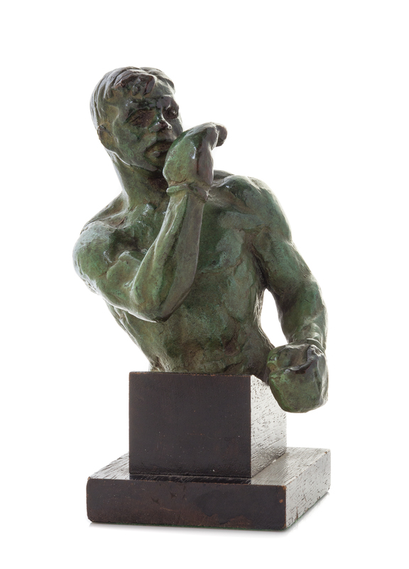 depicting a boxer with verdigris patina, on a wood base.