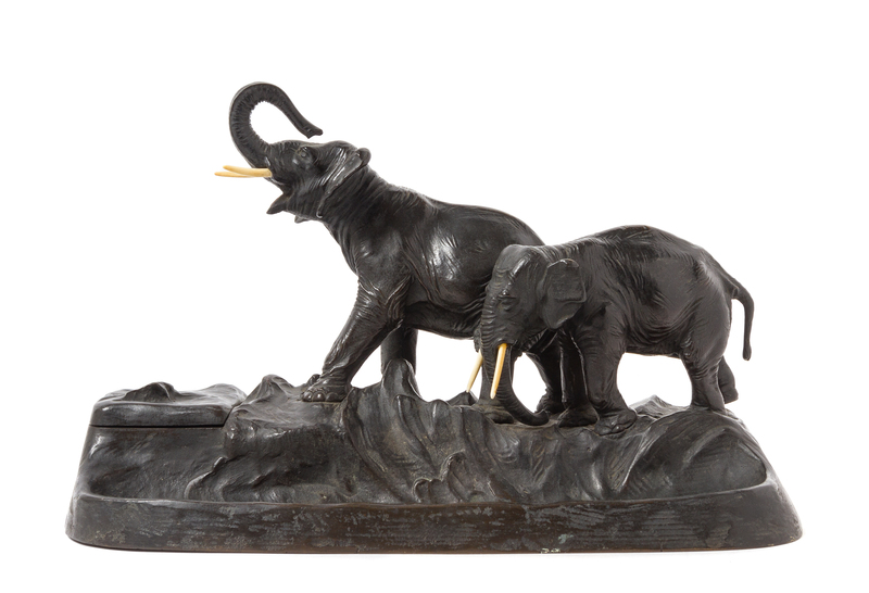cast with two striding elephants and a single ink pot, signed Titze at one side.